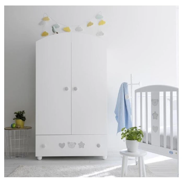 L’Armadio Birillo di Pali è dotato di simpatici inserti a forma di orsetto, cuoricino e stellina che decorano questo armadio in legno laccato. L’interno dell’armadio Made in Italy è diviso in due sezioni, a sinistra presenta due ripiani mobili mentre a destra un tubo appendiabiti. Birillo di Pali è verniciato con tinte atossiche a base d’acqua.
