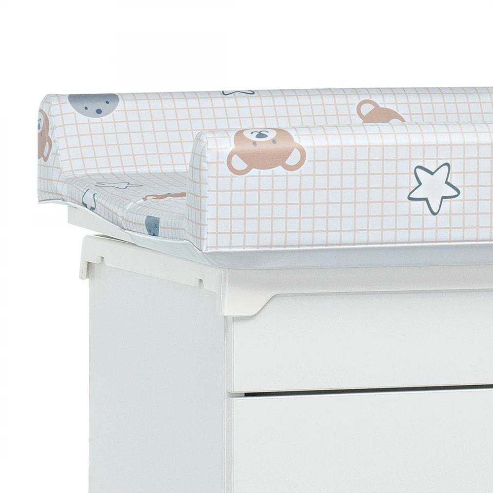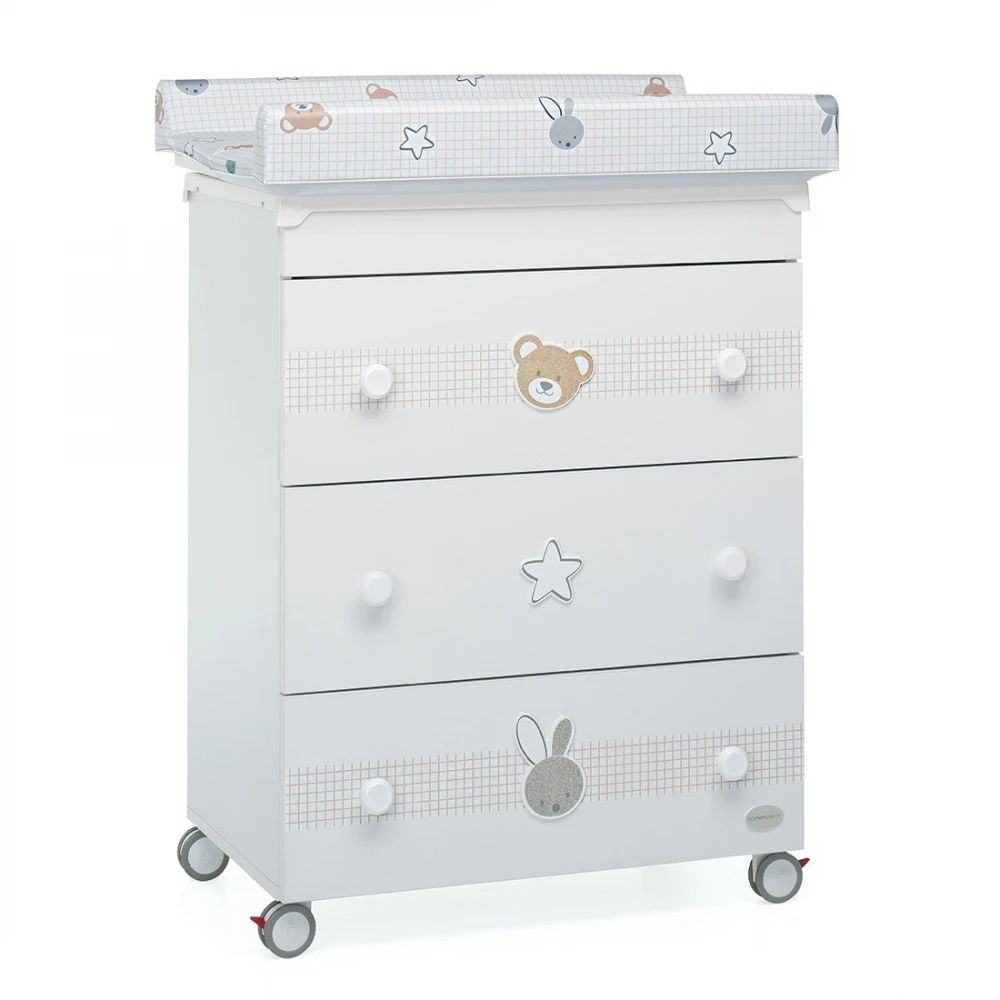 è caratterizzato da decorazioni sugli ampi cassetti: il tenero orsetto con l’amico coniglietto e una stellina in rilievo su un raffinato motivo a quadretti. Ha ruote gommate antigraffio, con sistema frenante, per facilitare gli spostamenti.