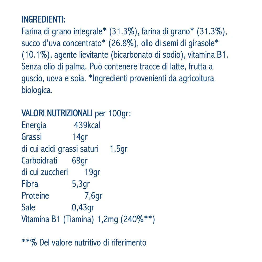 Ingredienti: Farina di grano integrale* (31.3%), farina di grano* (31.3%), succo d’uva concentrato* (26.8%), olio di semi di girasole* (10.1%), agente lievitante (bicarbonato di sodio), vitamina B1. Senza olio di palma. Può contenere tracce di latte, frutta a guscio, uova e soia. *Ingredienti provenienti da agricoltura biologica