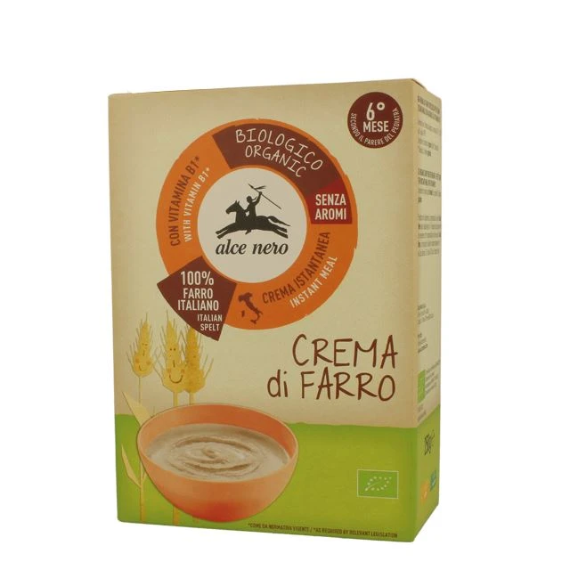 La crema di farro bio Alce Nero è preparata con farro 100% biologico coltivato in Italia, con l’aggiunta di vitamina B1 come da normativa vigente. Non contiene aromi, è istantanea ed è indicata a partire dal 6° mese in poi. Il farro è un cereale antico che viene coltivato da secoli in Italia. Si contraddistingue rispetto agli altri grani per il suo stelo lungo. Anni di esperienza nel biologico e nella messa a punto di delicati processi di lavorazione, ci permettono di ottenere una crema che nutre il bambino avvicinandolo al gusto dei cereali.