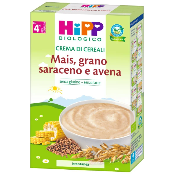 La Crema di Mais, Grano Saraceno e Avena di HiPP è ideale per lo svezzamento dal 4° mese in poi. Ottenuta dai preziosi cereali BIO privi di glutine, ha una consistenza cremosa ed è facilissima da preparare perchè pronta all’istante.