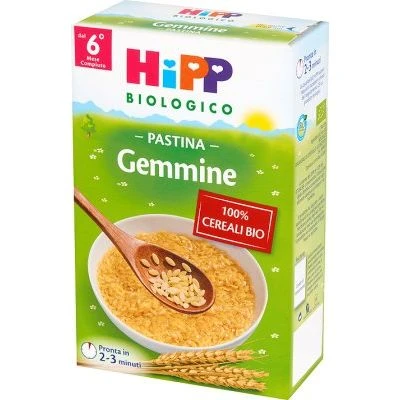 Hipp Biologico Pastina Gemmine introduce i bambini alla pasta con una ricetta a base di semola di grano duro proveniente da agricoltura biologica. Indicazioni nutrizionali: Hipp Bio Gemmine è un piatto buono e genuino da introdurre nella dieta del bambino già a partire dalle prime fasi di svezzamento. Arricchite di Vitamina B1 per migliorare le prestazioni energetiche, le gemmine sono ideali per preparare le prime pastine. Prova le gemmine con i gustosi omogeneizzati biologici della linea Hipp Bio.