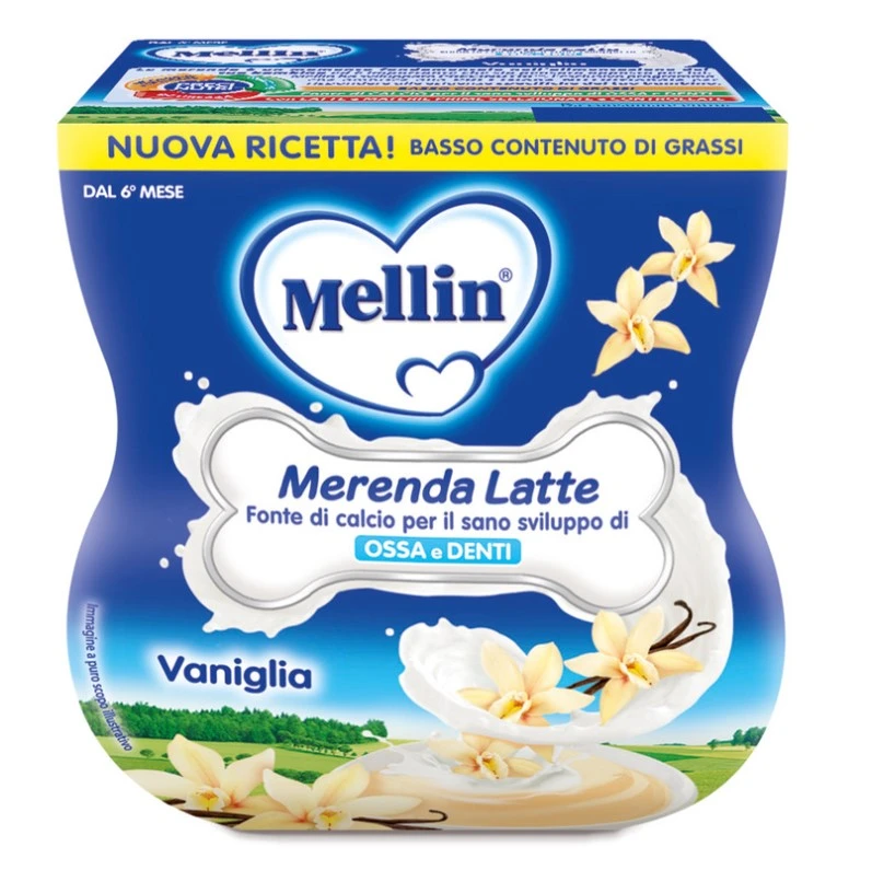 Mellin Merenda Latte e Vaniglia 2 x 100g. Alimento per la prima infanzia a base di latte e vaniglia.